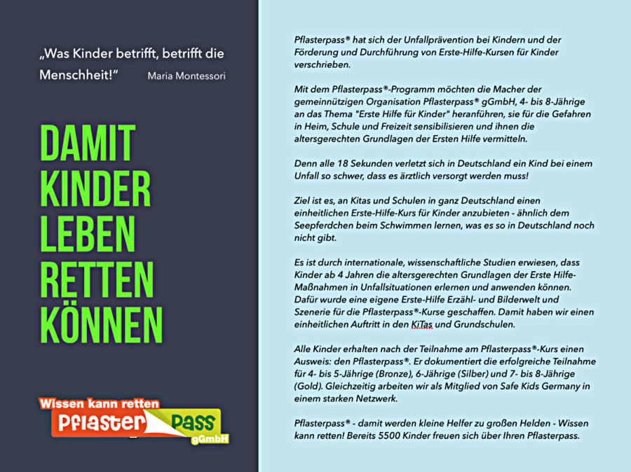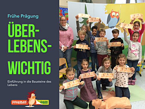Kinder für die Unfallgefahren in ihrer Welt sensibilisieren und sie befähigen, selbst Erste Hilfe zu leisten. Sie erhalten dann den Pflasterpass - vergleichbar einem "Seepferdchen" in Erster Hilfe.